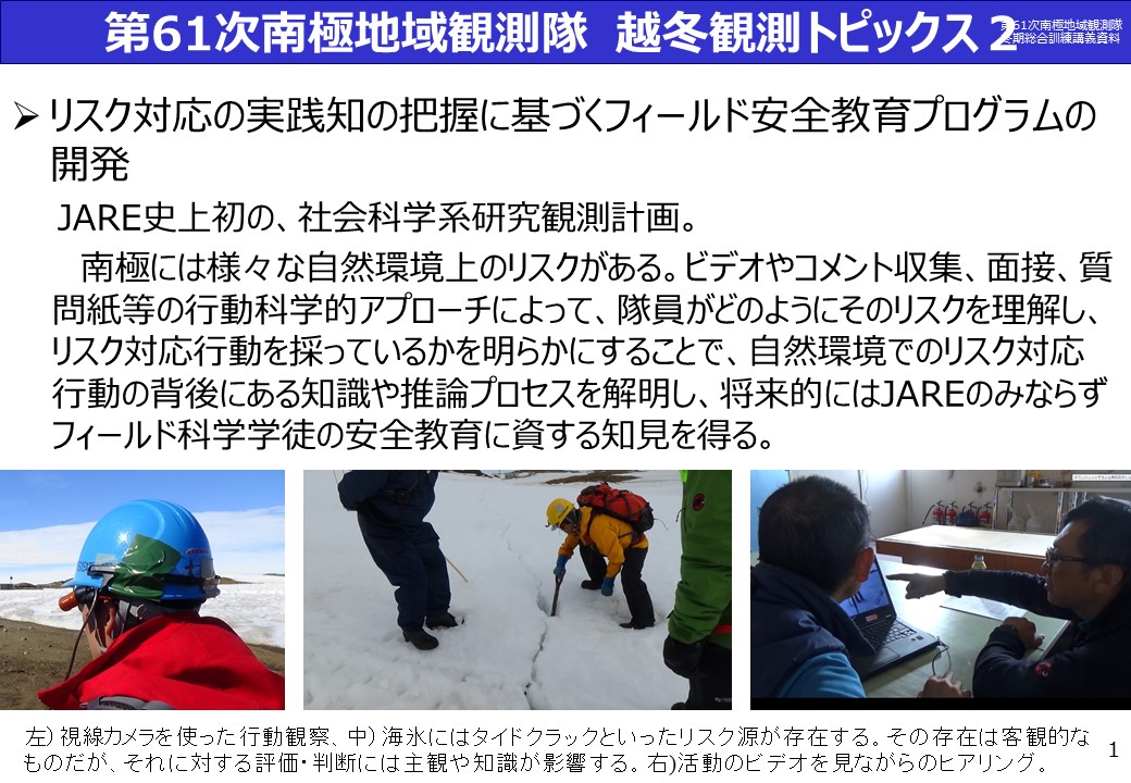 開始から60年以上たった今でも、南極は自然科学に多くの発見をもたらしている。そこは氷に覆われた、一般の人には近づくことすら難しい大陸である。だが、自然科学が発見を業績としている以上、そこには多くの未知のデータが科学者に発見されるのを待っている。しかも、地球上の他の場所にはほとんどない寒冷と雪氷という環境が、そこにしかないデータの蓄積を可能にしている。たとえば、59次隊から始まった100万年のアイスコアの掘削がそれだ。南極の氷は水が凍ったのではなく降った雪が圧雪されて氷になる。その過程で降った時の大気が雪の中に閉じ込められる。氷面を深く掘れば掘るほど古い大気が閉じ込められている。大陸の山頂部(といっても高原状の場所だが)をできるだけ深く掘れば、そこには太古の大気が眠っているのだ。約3000m掘って100万年間の大気を手にいれる。そのプロジェクトが進行中である。